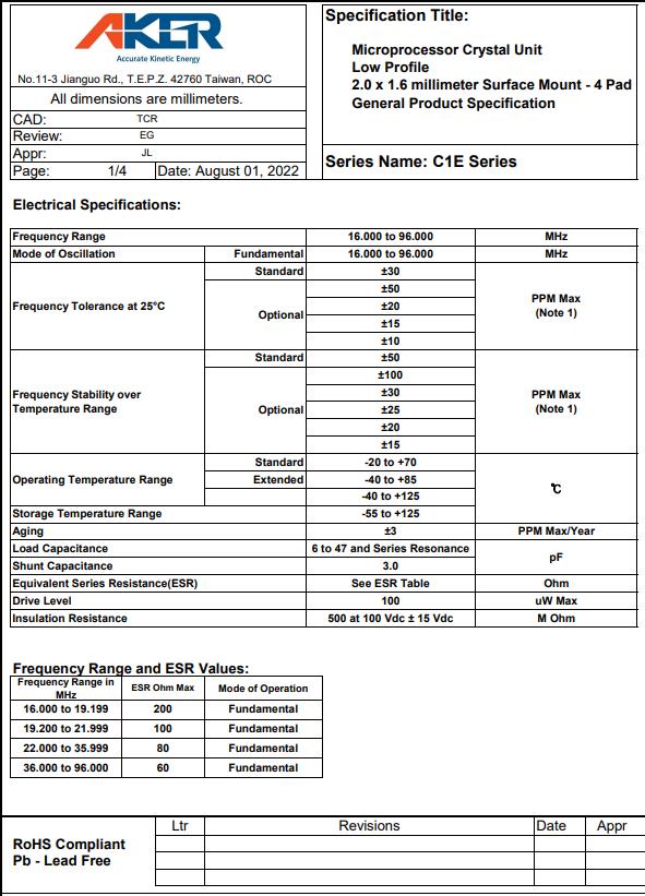 | C1E-96.000-8-1216-X2-R | Aker晶振 | C1E | 96 MHz | ±16ppm | ±12ppm | 8pF |