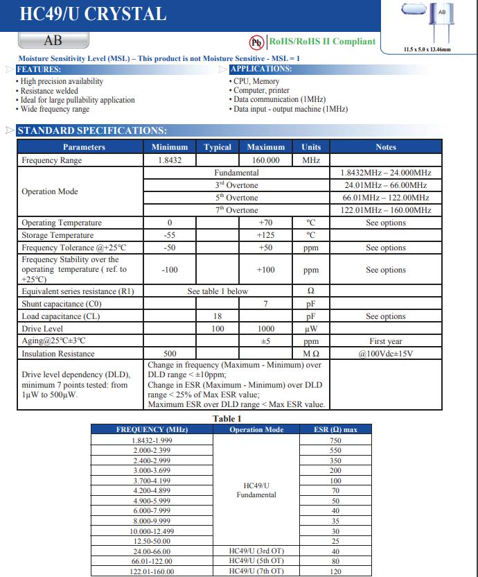 | AB-18.432MHZ-B2 | Abracon晶振 | AB | 18.432MHz | ±100ppm | ±20ppm | 18pF |