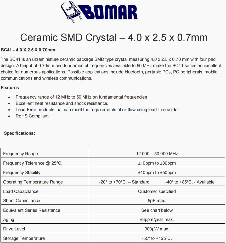 Bomar石英晶振,6G網絡傳輸晶振,BC41EFD120-24.000000四腳晶振,美國Bomar晶振公司,進口晶振,歐美晶振,SMD晶振,BC41晶振,小體積晶振,無源晶振,貼片晶振,四腳晶振,6G路由器晶振,6G信號接收器晶振,4025晶振,石英晶振,BC41是一款尺寸為4.0 x 2.5 x 0.70 mm的超微型陶瓷封裝SMD型晶體,采用四焊片設計。0.70mm的高度和50 MHz的基頻使BC41系列成為眾多應用的絕佳選擇。可能的應用包括藍牙、便攜式個人電腦、個人電腦外圍設備、移動通信和無線通信。