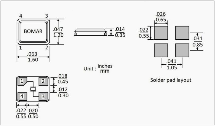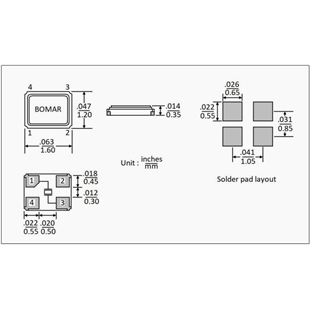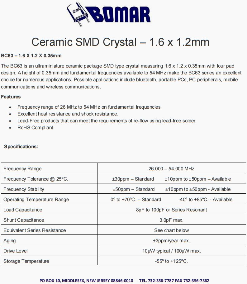 Bomar無源晶振,BC41EFD120-37.400000四腳晶振,無人機信號接收器晶振,美國Bomar晶振公司,進口晶振,歐美晶振,BC63晶振,1612晶振,石英晶振,超小型晶振,無源晶振,貼片晶振,四腳晶振,6G路由器晶振,6G通訊設(shè)備晶振,BC63是一款尺寸為1.6 x 1.2 x 0.35mm的超微型陶瓷封裝SMD型晶體,采用四焊片設(shè)計。0.35mm的高度和54 MHz的基頻使BC63系列成為眾多應用的絕佳選擇。可能的應用包括藍牙、便攜式個人電腦、個人電腦外圍設(shè)備、移動通信和無線通信