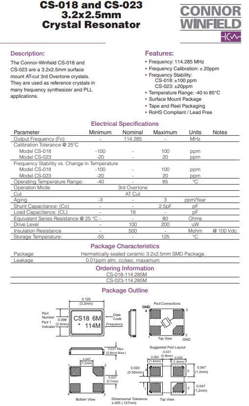 | CS-018-114.285M | Connor-Winfield晶振 | CS-018 | 114.285MHz | ±100ppm | ±100ppm | 18pF |