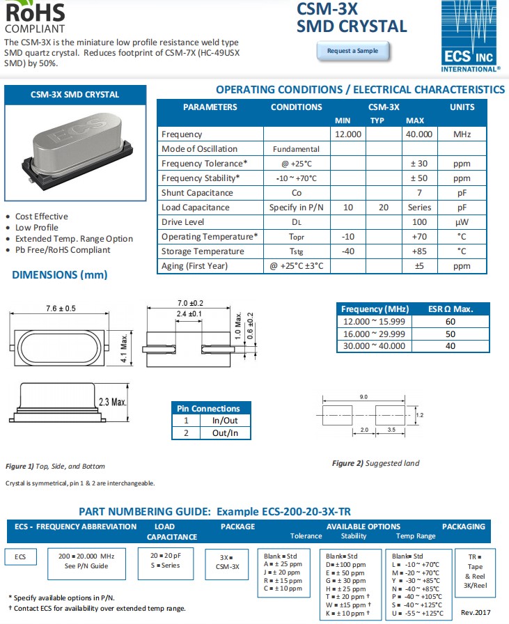 伊西斯SMD石英晶體CSM-3X,ECS-286.3-20-3X-EN-TR車載晶振,ECS-184-20-3X-TR,晶體諧振器,ECS伊西斯晶振,美國進口晶振,CSM-3X是一種小型低輪廓電阻焊縫型SMD石英晶體,將CSM-7X(HC-49USX SMD)的占用空間減少50%。石英晶體諧振器,ECS-120-20-3X-TR無源晶振,ECS-147.4-20-3X-TR石英晶振,兩腳貼片晶振,ECS-120-20-3X-EN-TR無鉛環保晶振,頻率范圍:12MHz~40MHz,小體積,輕薄型,耐熱及耐環境特點,SMD石英晶振適用于移動通訊設備,無線網絡晶振,藍牙模塊晶振,汽車電子晶振,車載晶振,數碼電子晶振,安防設備,智能家居,物聯網等應用。