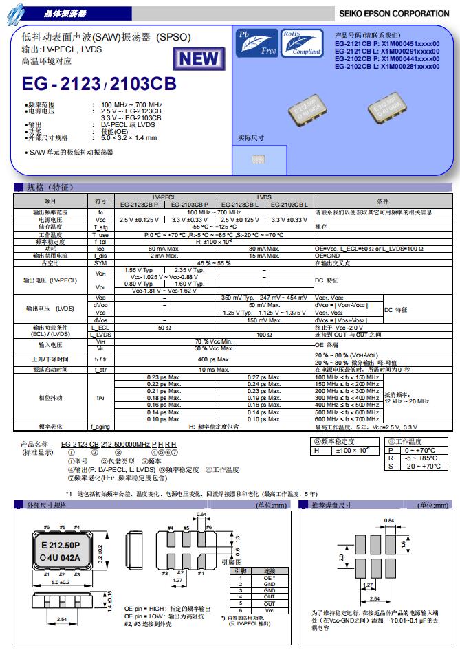 EG-2103CB220.000000MHzLHRH,6G模塊差分晶振,愛普生進口晶振,EG-2103CB有源晶振,EG-2103CB220.000000MHzLHRH晶振,愛普生進口晶振,石英晶體振蕩器,頻率220MHz,電壓3.3V,頻率穩定性100ppm,工作溫度-5~85°C,LVDS輸出晶振,6G模塊差分晶振,低抖動晶振,無線通信設備晶振,網絡交換機晶振,SATA晶振,電信交換機晶振.