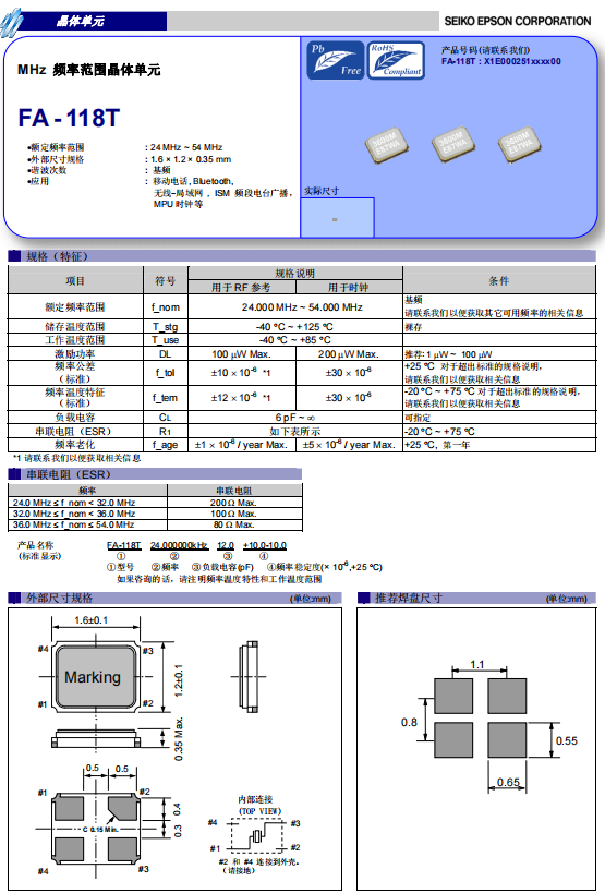 X1E0002510032-40.0000MHz-10pf-1612mm,X1E0002510032晶振,FA-118T無源晶振,頻率40.0000MHz,負載10pf,尺寸1612mm,Epson進口晶振,超小型晶振,移動電話晶振,無線局域網晶振,ISM頻段電臺廣播晶振,MPU時鐘晶振,藍牙模塊應用晶振.