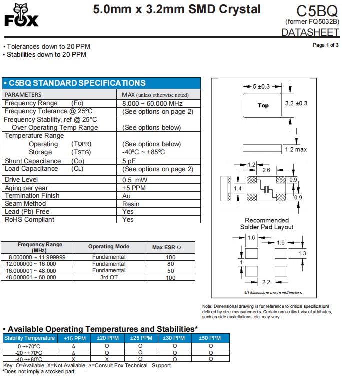 | FC5BQCCMC15.0-T1 | Fox 晶振 | C5BQ | 15 MHz | ±30ppm | ±30ppm | 20pF |