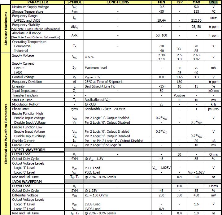 美國CTS晶振335的工作條件如下:最大的電源電壓VCC - -0.5 - 5.0 V,儲存溫度測試- -55 - 125°C,頻率范圍:LVPECL和LVDS 19.44 - 212.50,頻率穩(wěn)定度,控制電壓VC VCC = 3.3 V 0.0 1.65 3.3 V,在裝運時間頻率偏移Δf 25°C - 130±ppm,L線性最佳直線符合-15年10 15%,輸出工作周期對稱@ 1.25 v 45 - 55%,差動電壓VOD RL = 100歐姆250 350 450 mV,上升和下降時間TR,TF - 0.4 - 1.0 ns @ 20% - 80%的水平