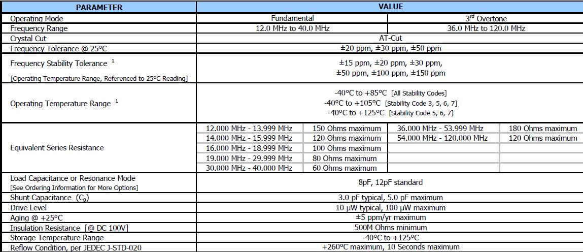 標(biāo)準(zhǔn)3.2毫米x 2.5毫米玻璃密封包,無鉛終止完成,頻率范圍12 - 40 MHz基本,36 - 120 MHz第三泛音,頻率公差;±20 ppm,±30 ppm和±50 ppm,頻率穩(wěn)定度、參考訂購信息,操作溫度,-40°C +125°C標(biāo)準(zhǔn),磁帶和卷軸包裝標(biāo)準(zhǔn),eia - 481,通過無鉛認(rèn)證符合歐盟指令2011/65 /歐盟.