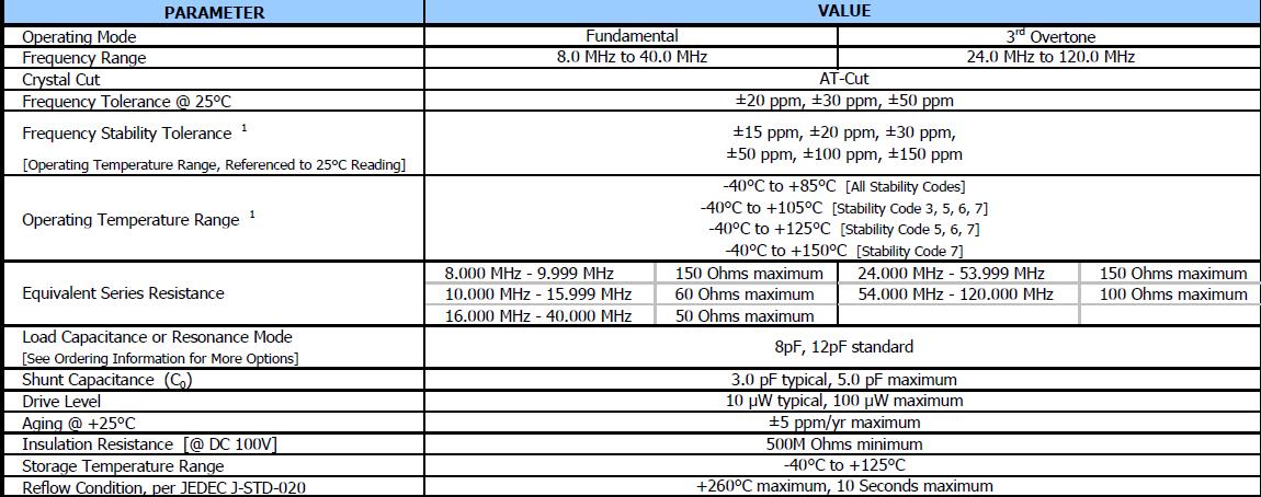 AEC-Q200兼容,標(biāo)準(zhǔn)5.0毫米x 3.2毫米玻璃密封包,基本晶體設(shè)計,頻率范圍8 - 40 MHz基本,24 - 120 MHz第三泛音頻率公差;±20 ppm,±30 ppm和±50 ppm,頻率穩(wěn)定度、參考訂購信息,操作溫度,-40°C + 125°C標(biāo)準(zhǔn),磁帶和卷軸包裝標(biāo)準(zhǔn),eia - 481,通過無鉛認(rèn)證符合歐盟指令2011/65 /歐盟,無鉛終止完成,豁免7(c)-我,電氣和電子元件含鉛玻璃(Pb).