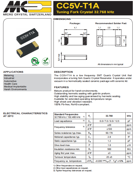 1.CC5V-T1A是一種低頻SMT石英晶體單元結合了一個音叉石英晶體諧振器,它在真空環境下工作,采用密封陶瓷包裝與陶瓷蓋