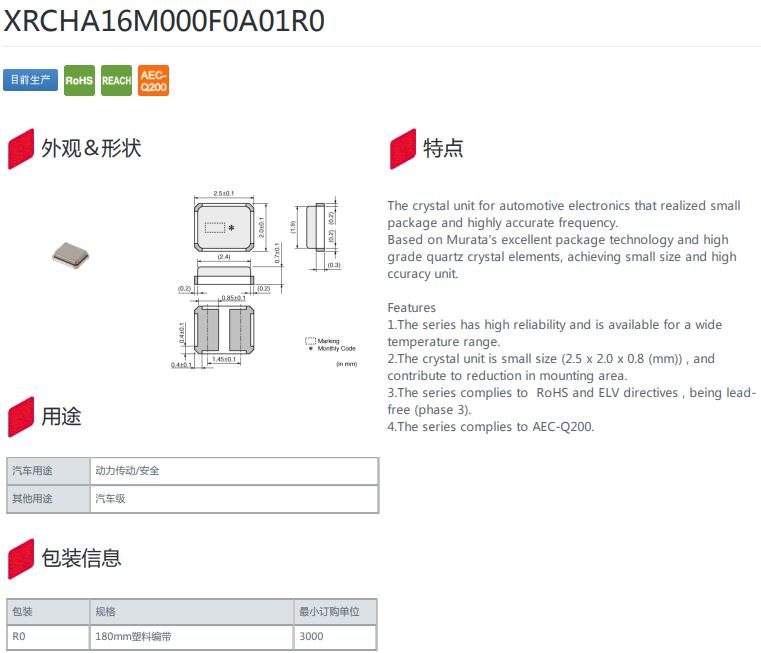 日本村田進口晶振HCR2520,XRCHA16M000F0A01R0汽車電子專用晶振,參數圖