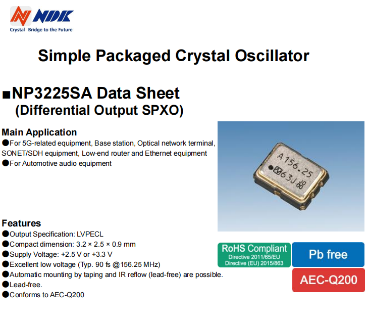 | NP3225SA | 212.5MHZ | NSC5235B | 3.2x2.5 | LVPECL | -40?+85 | +3.3±0.33 |