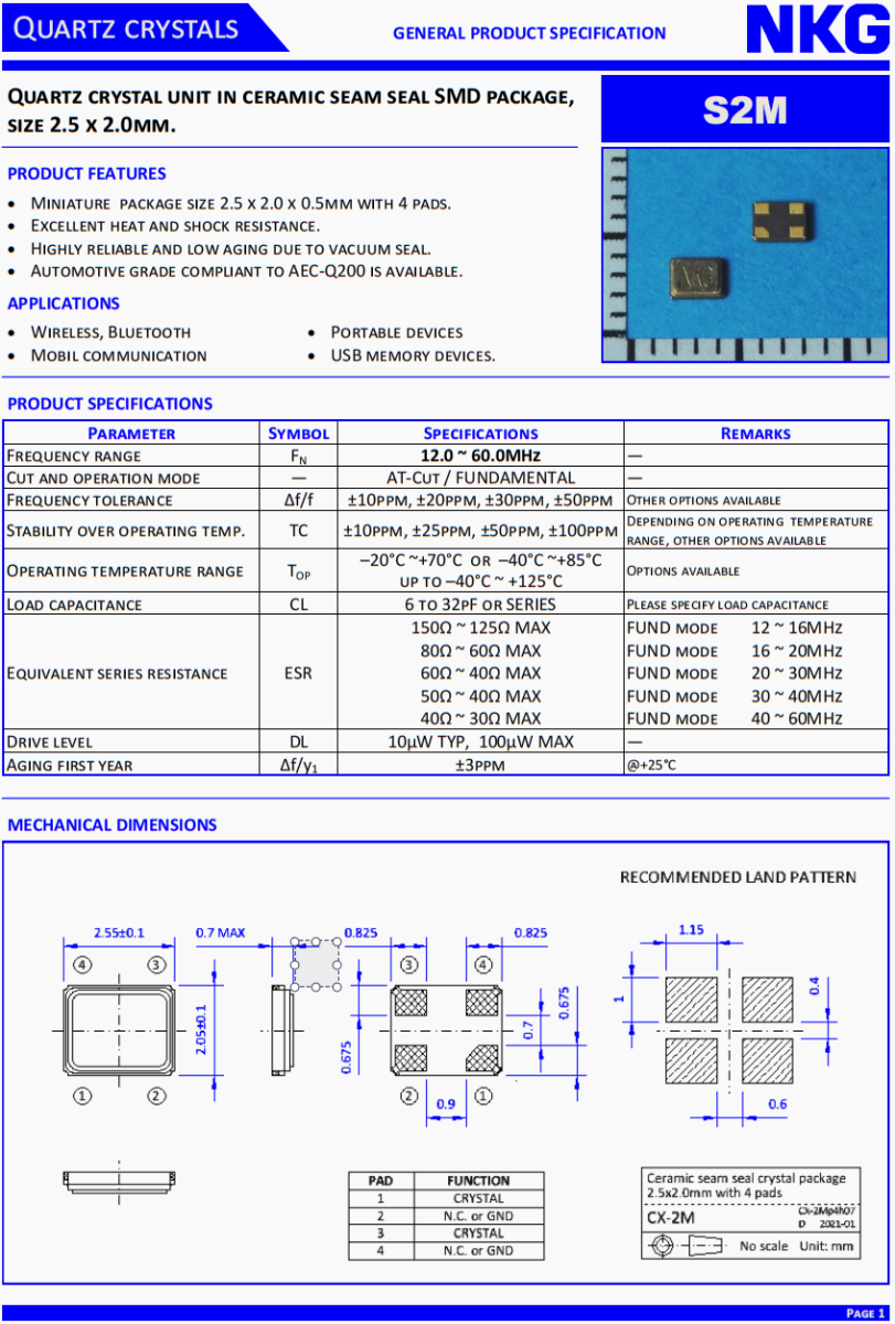 NKG汽車晶體,S2M48.0000F16M23-EXT環保晶振,液晶儀表盤晶振,NKG晶振公司,無源晶振,貼片晶振,超小型晶振,2520晶振,液晶儀表盤晶振,石英晶振,耐高溫晶振,汽車多媒體設備晶振,6G通訊設備晶振,6G網絡終端晶振,無源晶振,貼片晶振。石英晶體單元在陶瓷縫密封SMD封裝,尺寸25. x 2.0mm。產品特點:微型包裝尺寸2.5 x 2.0 x 0.5mm,有4個襯墊。優異的耐熱性和抗震性。真空密封,可靠性高,老化率低。符合AEC-Q200標準的汽車級產品可供選擇。應用范圍:無線、藍牙、移動通訊、便攜設備、USB存儲設備
