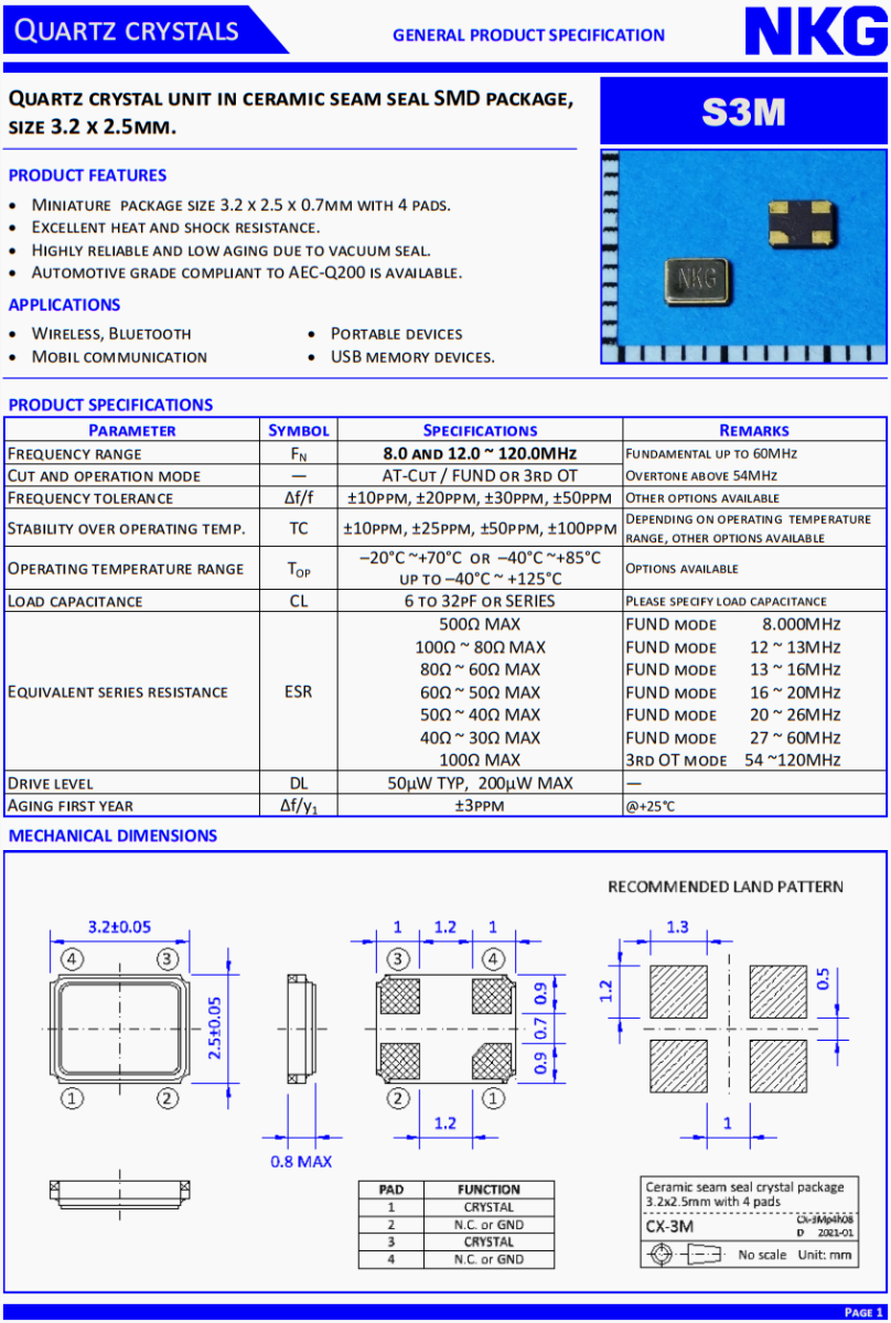 汽車胎壓監測裝置晶振,NKG3225晶振,S3M54.0000F12M23-EXT優質晶振,NKG晶振公司,無源晶振,貼片晶振,超小型晶振,3225晶振,液晶儀表盤晶振,石英晶體單元在陶瓷縫密封SMD封裝,尺寸3.2 x 2.5mm。產品特點:微型包裝尺寸3.2 x 2.5 x 0.7mm,有4個襯墊。優異的耐熱性和抗震性。真空密封,可靠性高,老化率低。符合AEC-Q200標準的汽車級產品可供選擇。應用范圍:無線、藍牙、移動通訊、便攜設備、USB存儲設備,石英晶振,耐高溫晶振,汽車多媒體設備晶振,6G通訊設備晶振,6G網絡終端晶振,無源晶振,貼片晶振。