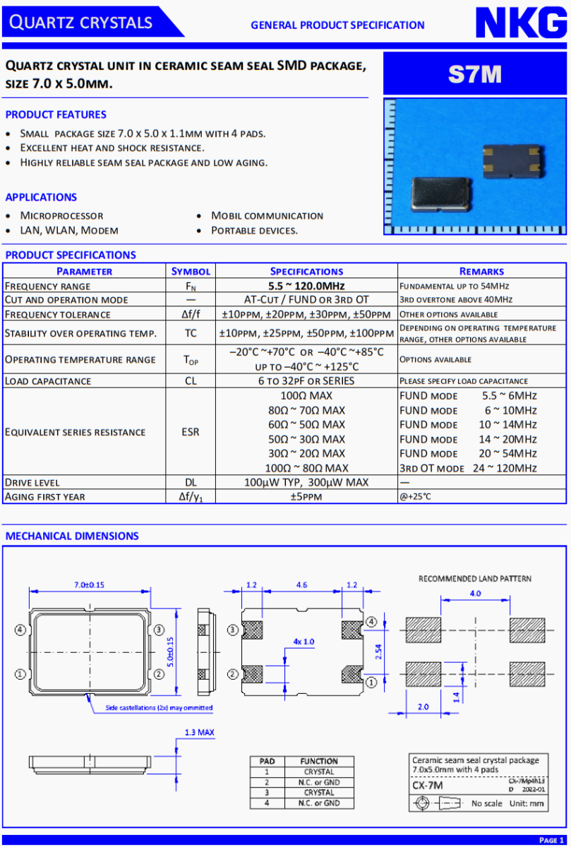 NKG7050晶振,S7M120.0000F18MYY-EXT晶振,車載氛圍燈晶振,。NKG晶振公司,無線傳輸晶振,汽車藍(lán)牙晶振,移動(dòng)通訊晶振,石英晶振,石英晶體單元在陶瓷縫密封SMD封裝,尺寸7.0 x 5.0mm。S7M。產(chǎn)品特點(diǎn):小包裝尺寸7.0 x 5.0 x 1.1mm, 4個(gè)襯墊。優(yōu)異的耐熱性和抗震性。高可靠的縫封封裝,低老化。應(yīng)用:微處理器,局域網(wǎng),無線局域網(wǎng),調(diào)制解調(diào)器,移動(dòng)通信,便攜式設(shè)備。高品質(zhì)晶振,低損耗晶振,汽車級晶振,車載音響系統(tǒng)晶振,便攜設(shè)備晶振,USB存儲(chǔ)設(shè)備晶振。4025晶振,小體積晶振,超薄晶振,貼片晶振,進(jìn)口晶振,