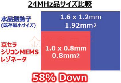 2.小型化的實現 對于24MHz產品,ESR特性通常要求為60ohm或更小,并且由于其物理特性,石英的尺寸限制為1.6×1.2mm.京瓷的硅MEMS諧振器通過其獨特的元件設計技術以1.0x0.8mm的小尺寸實現了所需的特性.面積比減小了58%.超小型的MEMS晶振模塊未來有可能會是主方向,但是石英晶振也會是不可或缺的,畢竟它的成本更低,而且性能方面也有優勢,無論是硅晶和石英,都是晶振主要的原材料.