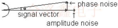 剛開始時(shí),相位噪聲可能看起來有些神秘,但是熟悉"普通"噪聲和"普通"功率譜密度的任何工程師都可以很快地提高速度,石英晶體振蕩器的輸出可以由相量圖表示. 該信號(hào)由一個(gè)向量表示,該向量的長度與信號(hào)幅度成正比,該幅度圍繞振蕩器的頻率圍繞原點(diǎn)旋轉(zhuǎn),這個(gè)矢量的頂端是一個(gè)隨機(jī)的,指向振蕩器的噪聲的小矢量.該噪聲矢量可以由兩個(gè)正交矢量表示,一個(gè)正交指向信號(hào)矢量的方向,一個(gè)正交指向旋轉(zhuǎn)的方向.振幅矢量是熟悉的振幅噪聲,另一個(gè)矢量是相位噪聲矢量.顯然,當(dāng)振幅矢量改變時(shí),振蕩器的整體振幅改變,而當(dāng)相位噪聲矢量改變時(shí),振蕩器的相位改變,盡管將幅度抖動(dòng)與總幅度進(jìn)行比較很直觀,將弧度的相位抖動(dòng)與載波的幅度進(jìn)行比較似乎是任意的,這兩個(gè)量似乎無關(guān).困惑在于小角度假設(shè)的腳,該假設(shè)指出小角度的正弦等于該角度.