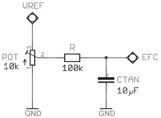 電位器POT應該是低噪聲(金屬陶瓷或金屬薄膜)類型,其電阻值必須選擇這樣,即不超過VREF輸出的最大允許電流損耗。10 kΩ在大多數情況下是合適的,強烈建議在VC輸入處附加濾波。