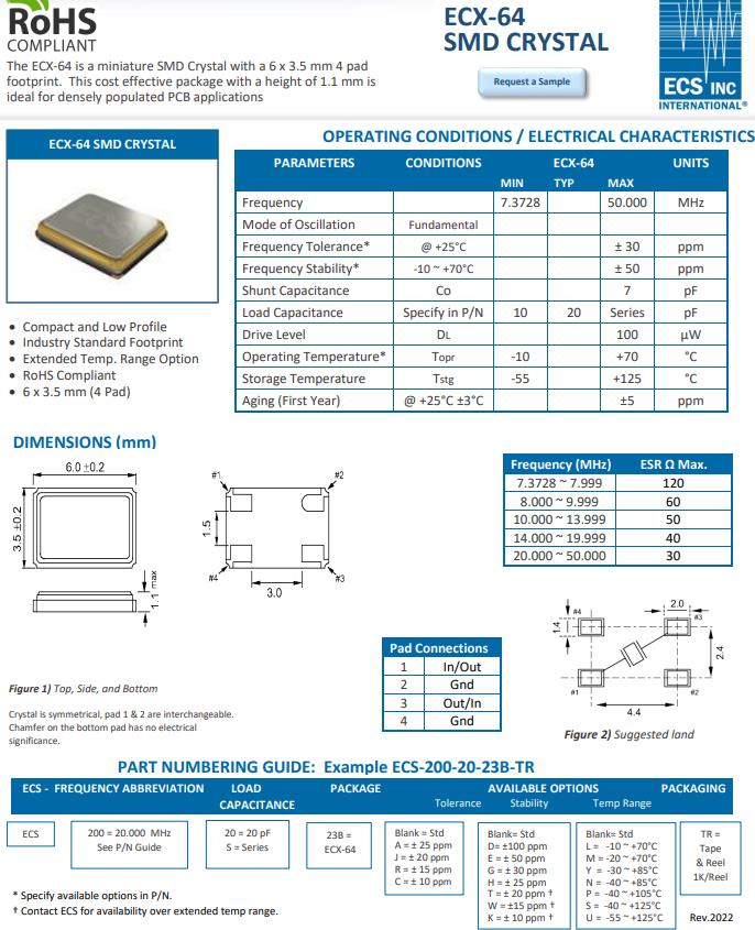編碼ECS-250-18-23B-F-TR,型號ECX-64是一種小型SMD晶振,石英諧振器,具有6.0x 3.5mm4襯墊足跡。頻率25MHz,頻率容差±30ppm,負載電容18pF,腳位4-SMD,這種具有成本效益的封裝高度為1.1毫米適合人口密集的PCB應用,