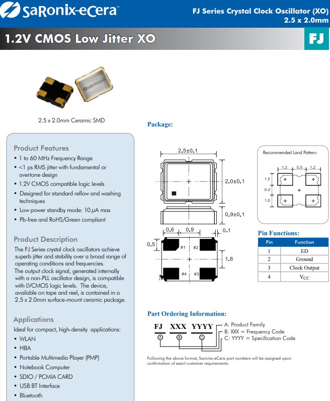 FJ系列1.2V時鐘晶體振蕩器,FJ1120001Z,FJ2500036Z,時鐘振蕩器,2520mm晶振,ECERA晶振