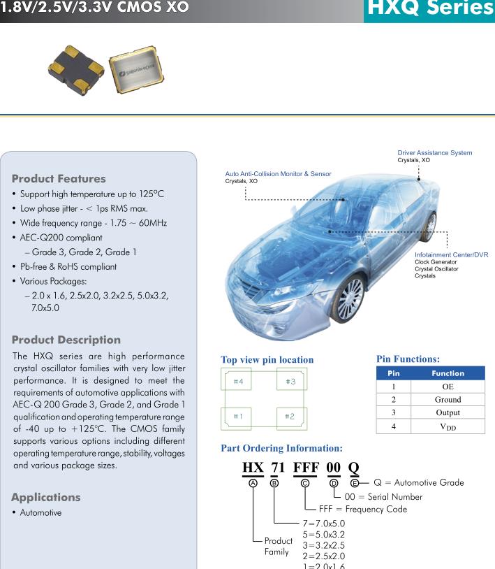 HXQ系列是高性能的具有非常低抖動的晶體振蕩器家族的性能。它是為了滿足要求與汽車應用AEC-Q 200三級,二級,一級資質和工作溫度范圍零下40到125°C。CMOS家族支持多種選項,包括不同的工作溫度范圍、穩定性、電壓以及各種包裝尺寸。