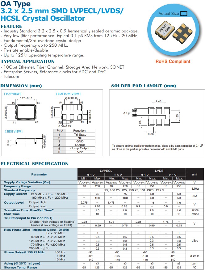 OA系列3.2x2.5毫米貼片LVPECL/LVDS/HCSL晶振,MHz范圍晶體振蕩器-OA型,典型的 3.2 x 2.5 x 0.9 mm密封陶瓷封裝,非常低的抖動性能:12k-20MHz 的典型值為 0.1 pS RMS,Fundamental/3rd 泛音水晶設計,輸出頻率高達 250MHz,三態啟用/禁用,特征: