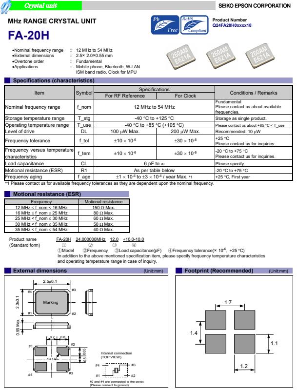 | Q24FA20H0069000 | 2.5 x 2 x 0.55mm | FA-20H | 12.000000 MHz | 8 pF | +/-10 ppm | +/-20 ppm |