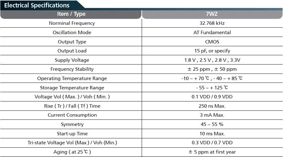 首先出場的是TXC 32.768K有源晶振中體積最大的7WZ石英晶振,參數如下:
