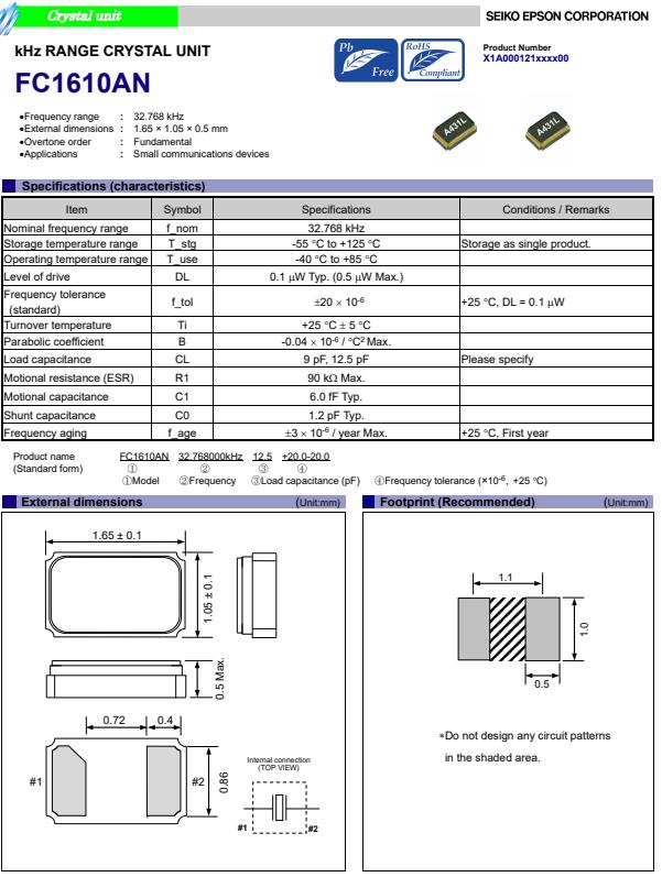 | X1A000121000600 | 1.65 x 1.05 x 0.5 mm | FC1610AN | 32.768kHz | 9 pF | +/-20.0 ppm | -40 to +85 °C |