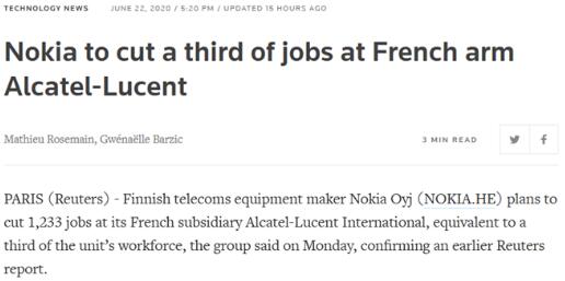 這次諾基亞一次性裁員1000多人,也會間接給供應鏈造成一定的影響,業務量減少訂單同樣也會變少.諾基亞這一裁員聲明公布于各國積極部署5G移動網絡之際,與此同時,這則聲明在疫情發展未見明朗的法國引發了一定程度的政治反響,因為諾基亞在5年前買下Alcatel-Lucent時,曾承諾保留工作崗位.據悉,承諾保留工作崗位這一條件加速了法國監管機構對該項收購交易的審批.