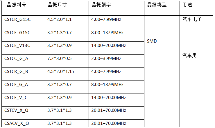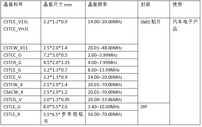 對于陶瓷晶振大家應該不陌生,通常我們在辦公室看到的電話座機就會使用到陶瓷晶振,還有家有的遙控電路模塊也會使用到ZTT(三腳)和(ZTA)兩腳陶瓷晶振。那么接下就是給大家盤點一些汽車專用的村田貼片晶振與插件晶振的參數,需要的可以拿個小本本記下來哦 村田晶振配備內藏負載電容器的緊湊封裝型片狀“CERALOCK(陶瓷振動子)”可保證極高的精確度,頻率的調整和表面封裝專有的技術,實現了負載電容器內藏片狀“CERALOCK”,振蕩電路無需任何外部連接負載電容器,內部采用了村田先進技術添加的內部負荷電容,適用溫度低溫可到-40℃至120℃符合現實汽車內置的高溫環境正常工作,產品具有外觀尺寸小,超薄,很適合汽車電子防盜遙控等小型產品應用。