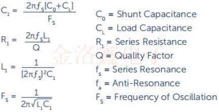 最常見(jiàn)的晶體設(shè)計(jì)之一是AT切割晶體,它將是貫穿本應(yīng)用筆記的參考晶體類型.對(duì)于1兆赫以上的頻率,通常只使用厚度剪切振動(dòng)模式.AT切割晶體的頻率由晶體的厚度決定,即晶體越薄,頻率越高.諧振器的振動(dòng)質(zhì)量相當(dāng)于一系列運(yùn)動(dòng)電感,L1.晶體的機(jī)械損耗表現(xiàn)為等效串聯(lián)電阻R1,而晶體的機(jī)械彈性相當(dāng)于串聯(lián)電容C1.C0是與保持器和電極電容相關(guān)聯(lián)的并聯(lián)電容.AT切割晶體具有良好的穩(wěn)定性和溫度特性,這是它們受歡迎的原因之一. 公式-等效電子