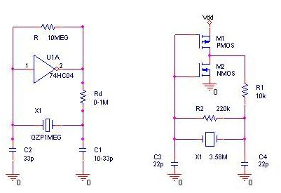 晶體穩頻的多諧振蕩器:為了得到頻率比較穩定的信號,需要晶體穩頻形式有多種,但單反相器方式最為簡單,也最常用,許多MCU都用這種形式