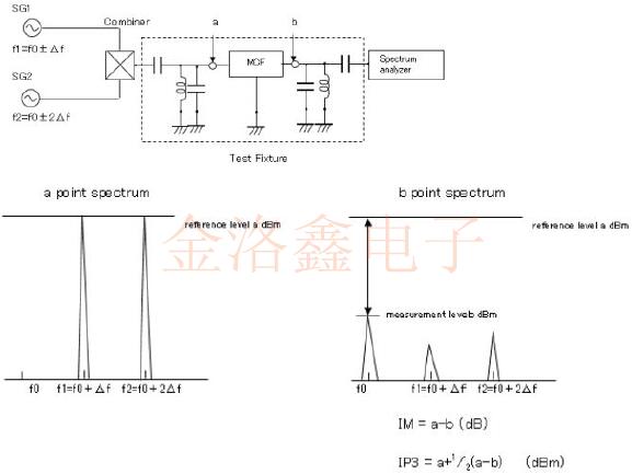 說明濾波器的重要特性——互調(diào)制.手機、電視、收音機等接收電波的設備,除了希望的電波外,其他強大的電波也同時到來.此時,電路中如果有非線性(輸出與輸入不成比例),就會發(fā)生互調(diào)這種有害現(xiàn)象.線性時,電路的輸出波用輸入波的一次函數(shù)表示,非線性時,會產(chǎn)生次數(shù)高的項,其中次數(shù)為奇數(shù)的項會發(fā)生互調(diào)(次數(shù)為偶數(shù)的項稱為高次諧波). 互調(diào)與三階交調(diào)點之間的關系: