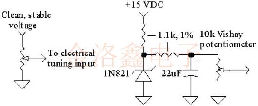 作為一種選擇,可以將振蕩器的內(nèi)部參考電壓引致一個(gè)引腳上,以連接到多圈電位計(jì)以進(jìn)行微調(diào).或者,可以將來自單獨(dú)電源的干凈DC施加到電調(diào)諧銷上.如果可用電源有噪聲或不穩(wěn)定,則可能需要添加一個(gè)齊納二極管或參考設(shè)備以及一個(gè)低通噪聲濾波器.溫度補(bǔ)償齊納二極管(如1N821)是提供良好溫度穩(wěn)定性和極低噪聲的絕佳選擇(在大多數(shù)情況下),以下所示的22uF濾波電容器可省去.參考設(shè)備具有出色的穩(wěn)定性,但它們通常具有相當(dāng)高的噪聲電壓,因此建議進(jìn)行額外的濾波器. 這里有幾點(diǎn)要考慮: