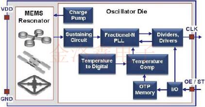 MEMS振蕩器由與模擬振蕩器IC封裝在一起的MEMS諧振器芯片組成.如圖1左側所示,有不同類型的MEMS諧振器可滿足不同的應用需求.MEMS諧振器連接到模擬IC上的MEMS Oscillator專用電路塊,并通過靜電激勵驅動.