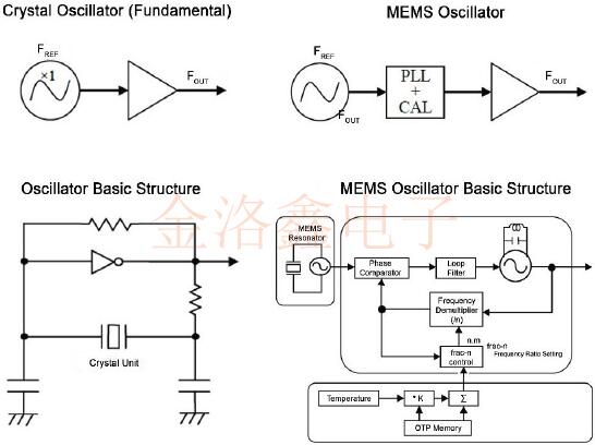 晶體振蕩器使用石英晶體基準(zhǔn)和簡單的振蕩器電路,MEMS振蕩器使用硅諧振器作為振蕩源,并需要PLL電路來校正頻率以達(dá)到制造公差和溫度系數(shù).正如這些基本結(jié)構(gòu)所示,晶體振蕩器是簡單構(gòu)建的高質(zhì)量時鐘.相反,MEMS振蕩器具有復(fù)雜的結(jié)構(gòu),該結(jié)構(gòu)由MEMS諧振器,分?jǐn)?shù)nPLL和溫度補償網(wǎng)絡(luò)組成.他們還需要進(jìn)行制造校準(zhǔn)才能正確運行.