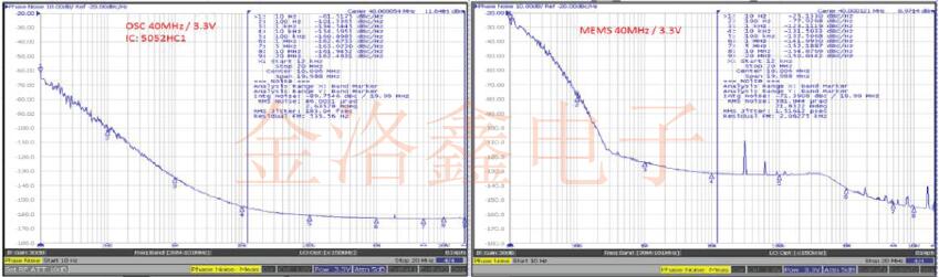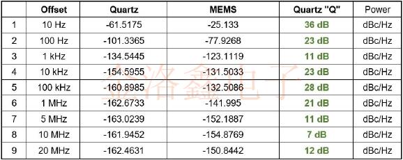 實驗室測量還表明,SMD有源晶振的相位噪聲要比MEMS振蕩器好得多.MEMS振蕩器具有較高的相位噪聲以實現(xiàn)低失調(diào),因為與石英相比,硅諧振器的”Q”或品質(zhì)因數(shù)較差.在10Hz時,石英振蕩器的相位噪聲比MEMS振蕩器好36dB.低失調(diào)的相位噪聲對于無線通信至關(guān)重要,并可能導(dǎo)致光通信中的某些錯誤.MEMS振蕩器在高失調(diào)(12kHz至20MHz)時也具有較高的相位噪聲,因為它們在PLL電路中使用了低QLC振蕩器.