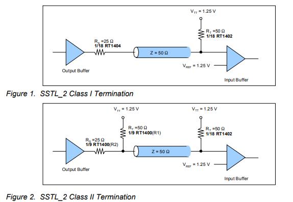 所需的終止樣式基于DDR內(nèi)存應(yīng)用程序。滿足EIA/JEDEC標(biāo)準(zhǔn)JESD8-9A正確信號(hào)處理要求的兩類終端如圖1和圖2所示。在0-2.5伏邏輯交換范圍內(nèi)工作的2.5VI/O存儲(chǔ)器總線標(biāo)準(zhǔn)是SSTL_2,該標(biāo)準(zhǔn)適用于高速DDRSDRAM接口。DDR本質(zhì)上不需要提高時(shí)鐘頻率就能加倍提高SDRAM的速度,它允許在時(shí)鐘脈沖的上升沿和下降沿讀出數(shù)據(jù),因而其速度是標(biāo)準(zhǔn)SDRAM的兩倍.