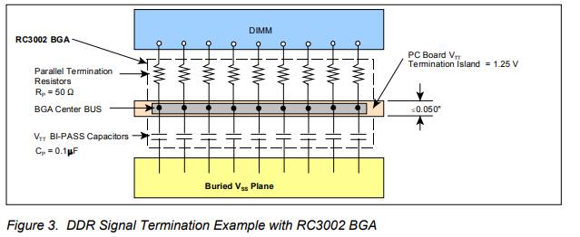 終止方法可以利用BGA樣式封裝提供的緊湊路由。建議使用I類電阻器端接方法以獲得最佳性能。它減少了所需的石英晶振元件數(shù)量/位置和電路板空間,同時(shí)提供更簡(jiǎn)單的信號(hào)路由,更少的反射以及更好的帶寬和穩(wěn)定性。VTT等于VREF,等于VDD的50%。VTT必須始終保持低于0.040伏特的VREF偏移。建議使用多個(gè)并聯(lián)電容去耦,并應(yīng)特別注意盡量減少ESR和ESL。