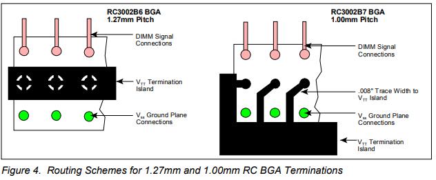 終端電阻應(yīng)盡可能靠近雙列直插式內(nèi)存模塊(DIMM)插槽,以最大限度地減少信號(hào)路由長(zhǎng)度。如果使用電阻陣列或僅帶終端電阻的BGA網(wǎng)絡(luò),雙通電容應(yīng)放置在VTT終端島和VSS平面之間,每?jī)蓚€(gè)終端電阻至少有一個(gè)0.01μF電容,間隔均勻。采用任何一種端接方法,PCB應(yīng)在端接島的每端包含一個(gè)10μF鉭電容,用于批量去耦。圖3顯示了采用帶終端電阻和雙極電容的BGA封裝的完整終端解決方案示例。