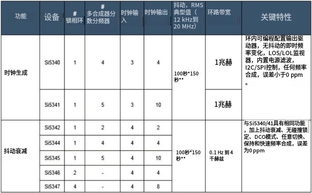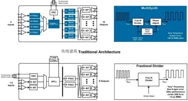 第四代DSPLL與傳統高性能時鐘架構Si5345/44/42抖動衰減器利用獨特的專有架構,與傳統時鐘架構相比,具有更高的頻率靈活性,更低的抖動,更低的相位噪聲和更好的雜散性能.這些新器件采用最先進的工藝技術設計,適用于任何獨立的時鐘器件(55納米CMOS),使得在單一統一架構中提供無與倫比的性能和頻率合成靈活性成為可能.Si5345支持靈活的輸入級,每個時鐘輸入具有獨立的小數分頻器.這種集成簡化了器件與各種不同時鐘源(如BITS,SyncE,SONET/SDH,PDH,ASIC,FPGA)的接口.DSPLL提供抖動衰減,任意頻率轉換,無中斷開關和保持功能.DSPLL將模擬LC-VCO與基于DSP的數字環路濾波器和數字鑒相器相結合.這種混合混合信號方法提供了兩全其美的優勢:在高度集成的數字可編程架構中實現低相位噪聲和低抖動時鐘合成.環路濾波器功能集成在片內,消除了分立濾波器元件,簡化了PCB布局.Si5345器件支持集成快速鎖定特性,無論環路帶寬設置如何(<100毫秒),都能實現極快的PLL采集.除了消除與外部聲表濾波器元件相關的噪聲耦合之外,DSPLL帶寬在0.1Hz至4kHz范圍內可由用戶編程,支持根據應用選擇環路帶寬,同時將抖動傳遞降至最低.相比之下,大多數傳統APLL解決方案需要分立環路濾波器,這種濾波器對電路板級噪聲非常敏感,會影響抖動的產生,并增加PCB布局的復雜性.5|DSPLL驅動五個獨立的多同步小數分頻器,這些分頻器通過非阻塞式交叉點開關連接到10路時鐘輸出陣列.在MultiSynth架構的第一階段,Skyworks晶振的MultiSynth高速小數N分頻器在兩個最接近的整數分頻器值之間無縫切換,以產生精確的輸出時鐘頻率,頻率合成誤差為0ppm.為了消除此過程產生的相位誤差,MultiSynth會計算小數N分頻器產生的時鐘與所需輸出時鐘之間的相對相位差,并動態調整相位以匹配理想時鐘波形.這種新穎的方法可以產生1kHz至800MHz范圍內的任意輸出時鐘頻率,0ppm誤差,同時在整數模式下實現優于100fsRMS的相位抖動性能(12kHz至20MHz),在合成模式下實現小于150fs的性能,同時產生小數和整數相關時鐘.相比之下,傳統架構依賴不執行相位誤差消除的傳統小數分頻器,因此當器件配置為產生小數輸出時鐘時,輸出抖動明顯更高.