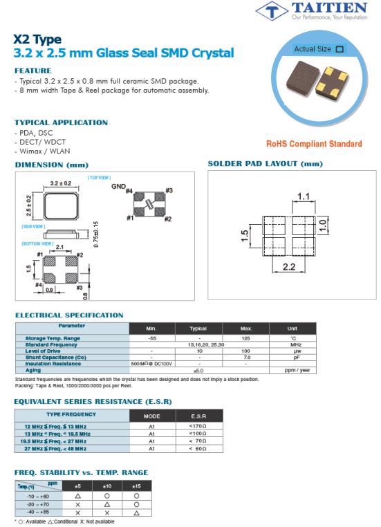 | X2CGGCSANF-25.000000 | Taitien晶振 | X2 | 25MHz | -20°C ~ 70°C | 0.126" L x 0.098" W (3.20mm x 2.50mm) |